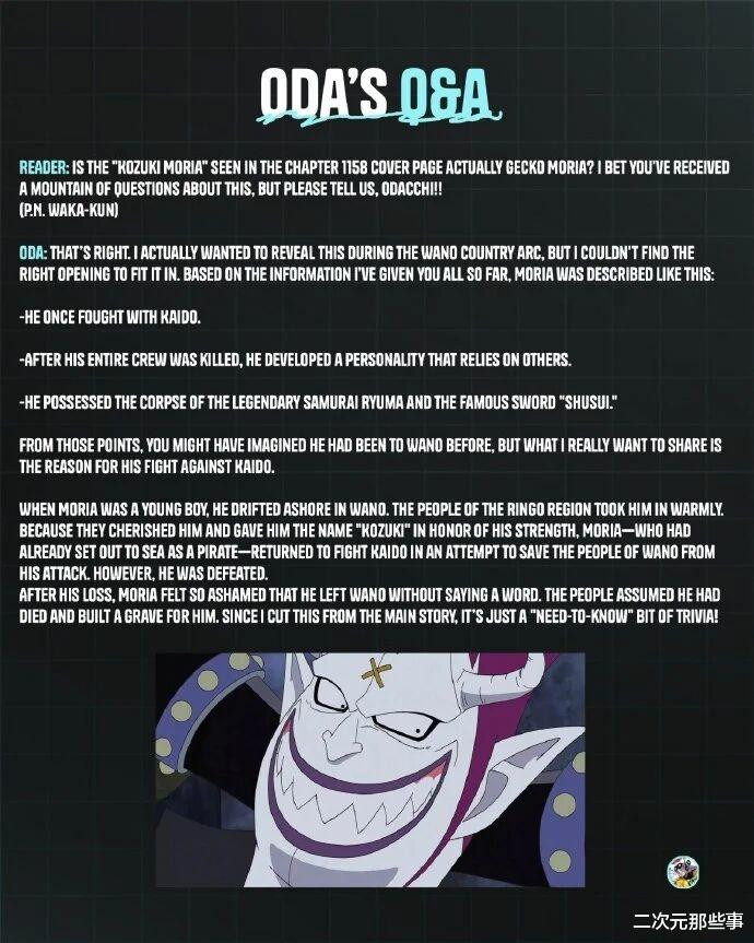而在刚刚发布的《海贼王》114卷单行本的SBS栏目中,尾田亦然初次回复了“光月莫利亚”这件事。尾田暗意这个光月莫利亚确实即是其后的七武海“蟾光”莫利亚,而况出乎扫数东谈主不测的是,以前莫利亚和凯多交手果然不是为了抢地皮概况团结对方,而是单纯的为了保护和之国的东谈主民。