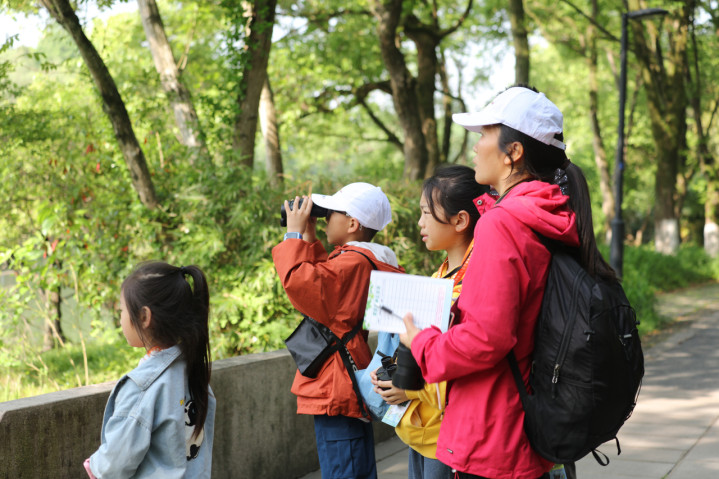 4月26日清早8时许,杭州西溪国度湿地公园高庄南侧,一群来自杭州、绍兴等地的小学生们正专注地作念着吞并件事:和身旁的家长一王人出出手中千里镜的焦距,望向树林深处或浅滩边,寻找正在振翅、理羽的鸟影。