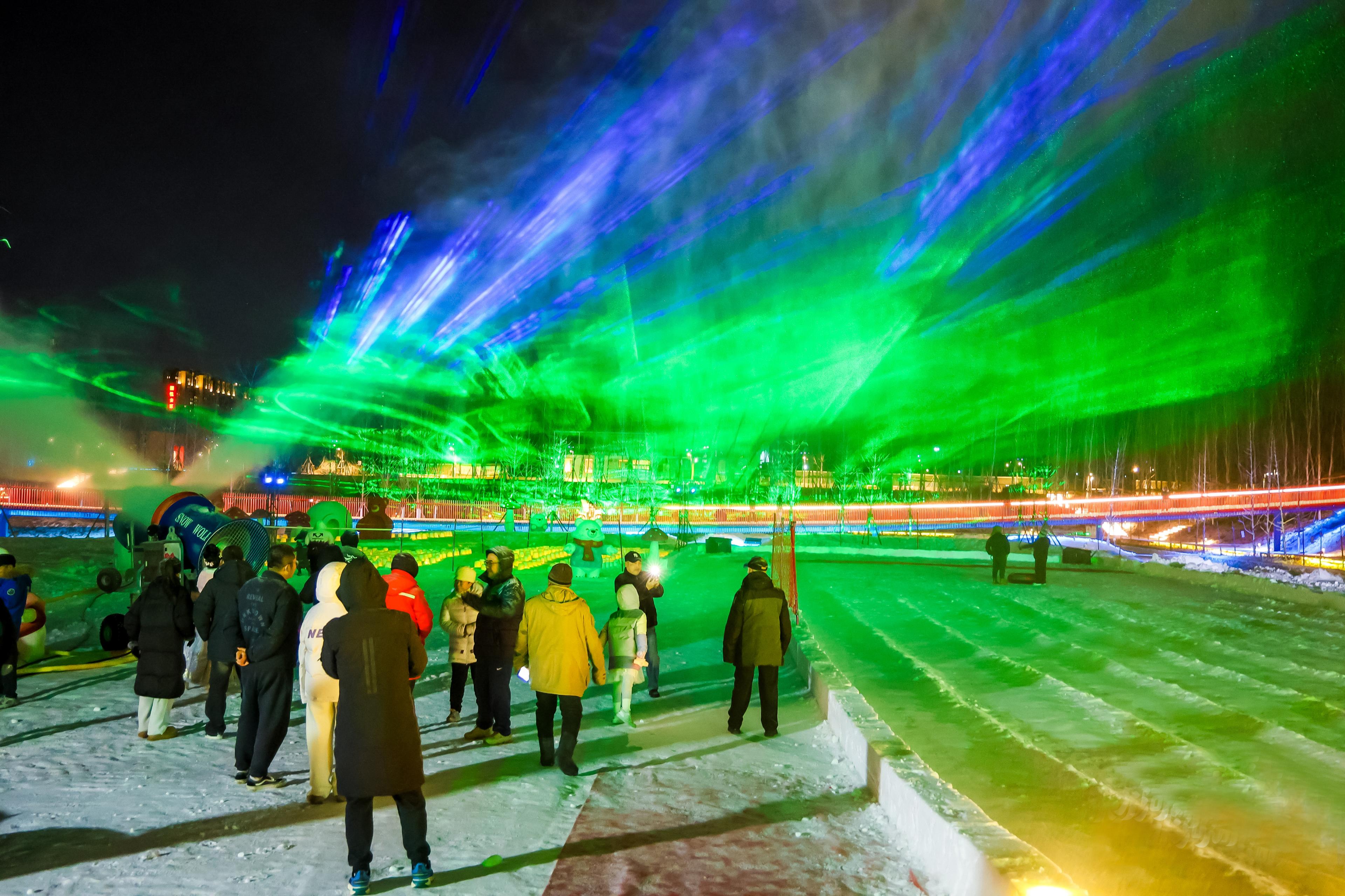 冰雪酷爱者刘梓涵依然是第三次来看“极光”了约上三五好友,一都在“极光”中冲下滑谈,疾雷不及掩耳,止境有虚幻感。每逢节沐日及周末,夜幕来临,气温降至零下3摄氏度,造雪机便喷出细碎雪花,与五彩激光束在空中再见,颜色交汇流转,以太空为幕布,让“极光”好意思景照亮冬昼夜晚。