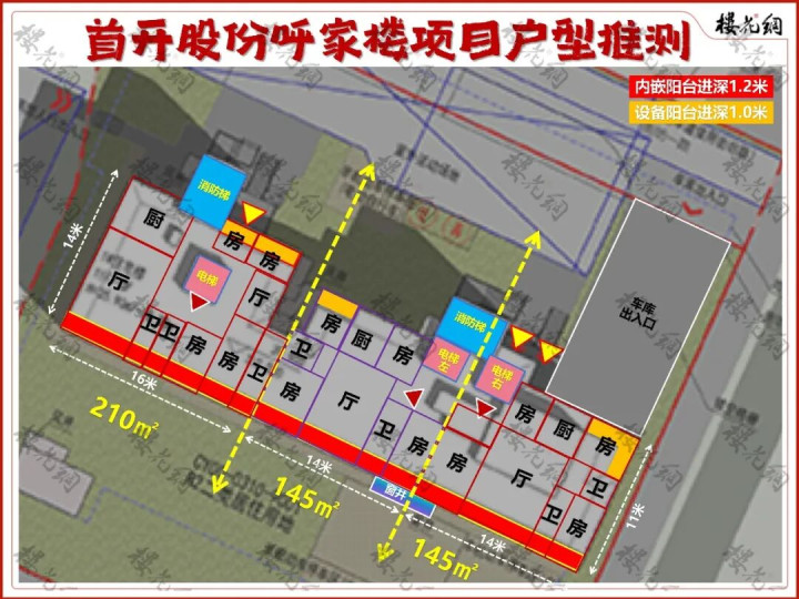 花姐推测,它有两款户型:西边单位两户,每户建面145平米;东边单位独门独户,每户210平米。